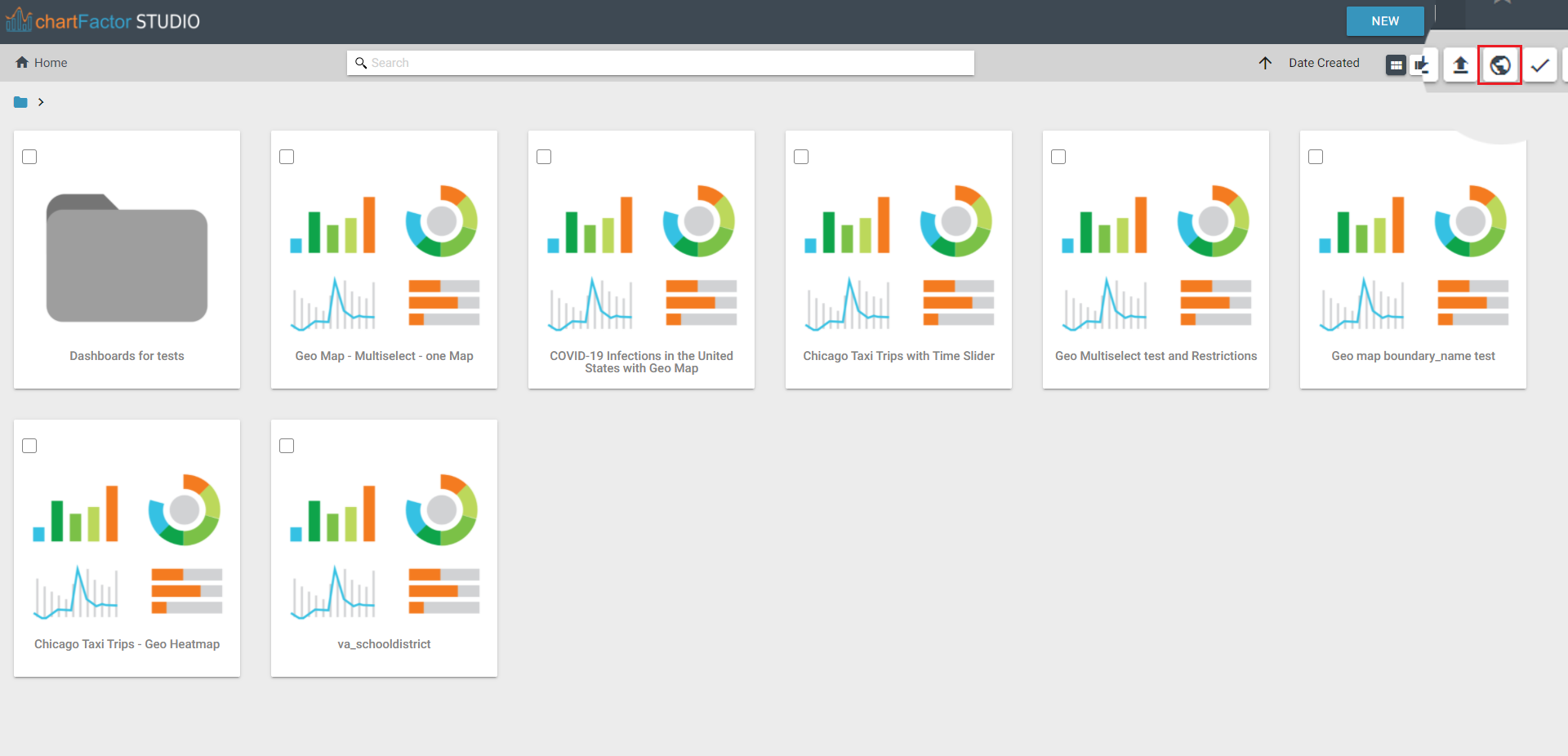 To generate a web app from the Studio home page, select one or many dashboards or even a folder containing up to 10 dashboards. Then select the Generate Web App function on the top right corner of the ChartFactor Studio home page.