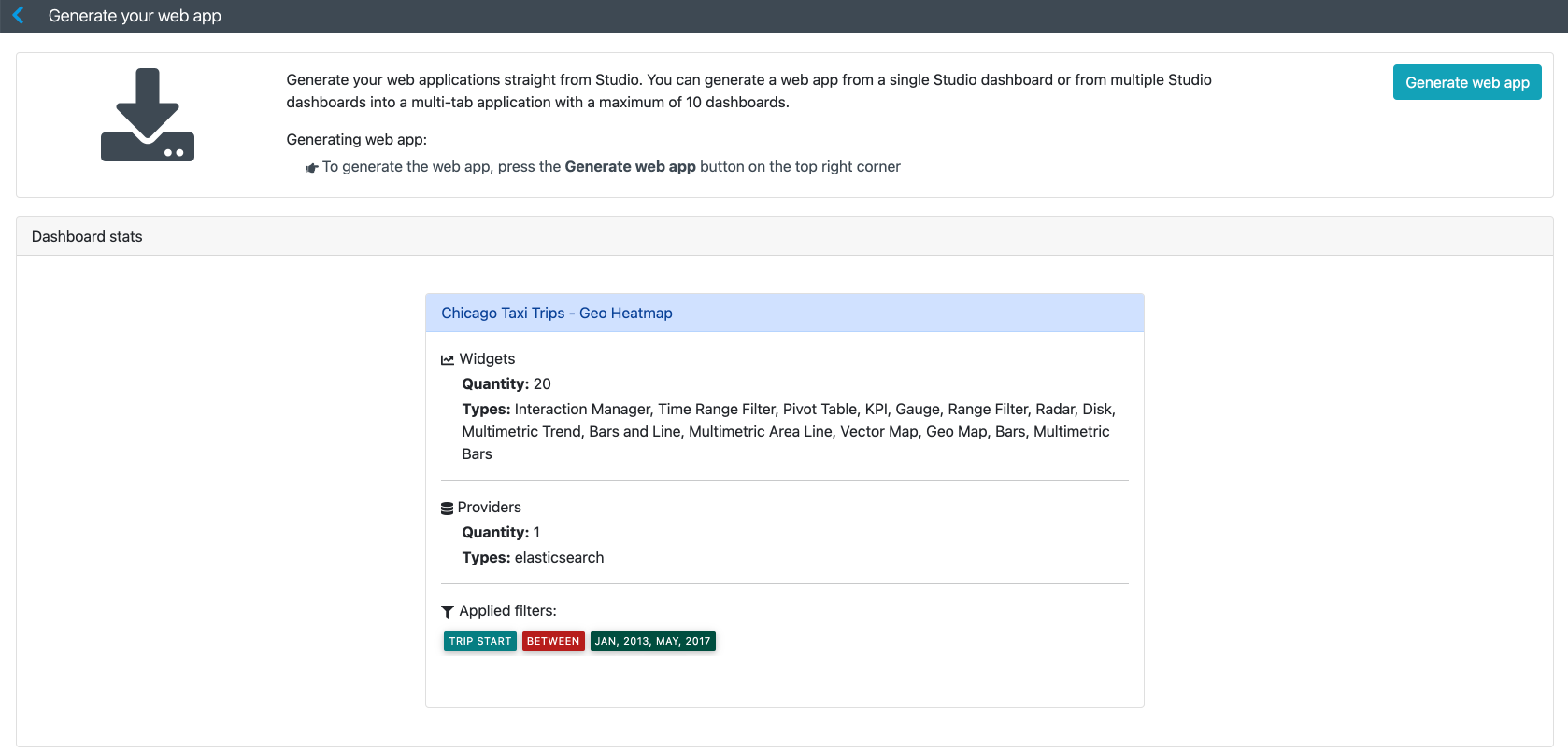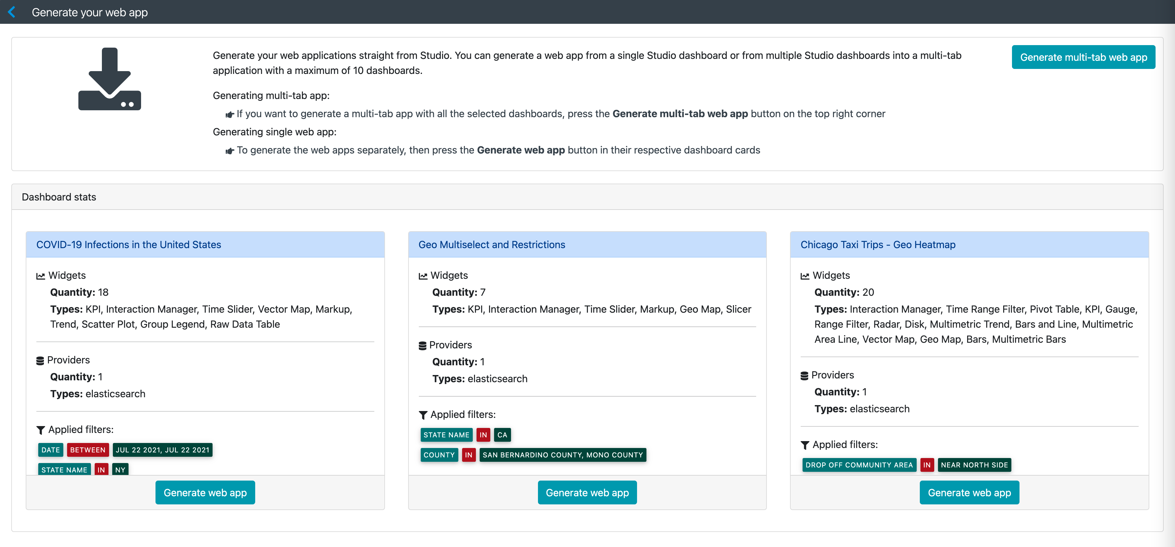 You can generate your JavaScript web application with one or many dashboards in a single app. You can generate web applications from the home and dashboard Studio pages.