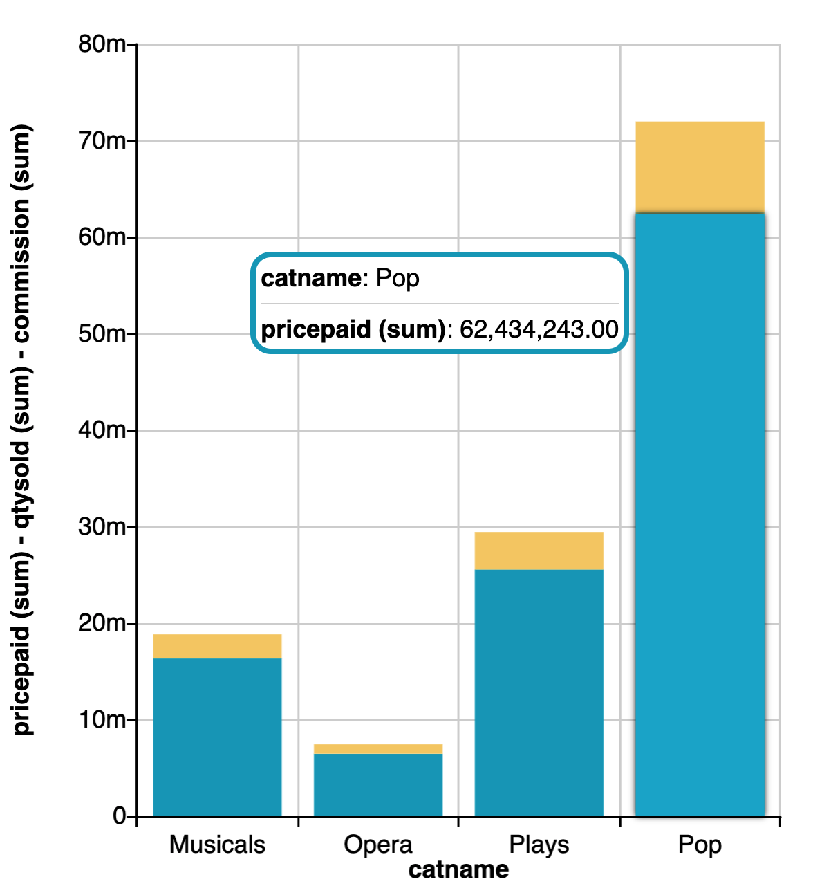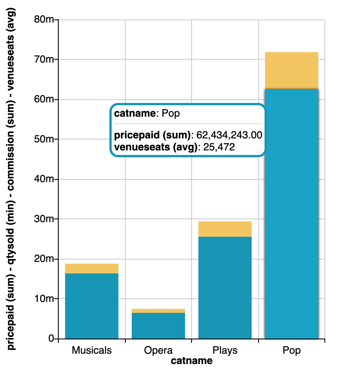 Note that in the above visualization, two metrics where included: "pricepaid" (blue) and "commission" (yellow), where the first one (the blue section) is being hovered. The more metrics we add, the more sections (or bars if the placement is clustered) will be created.