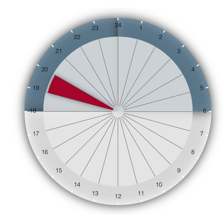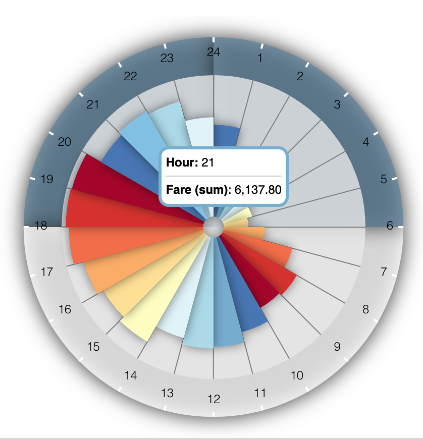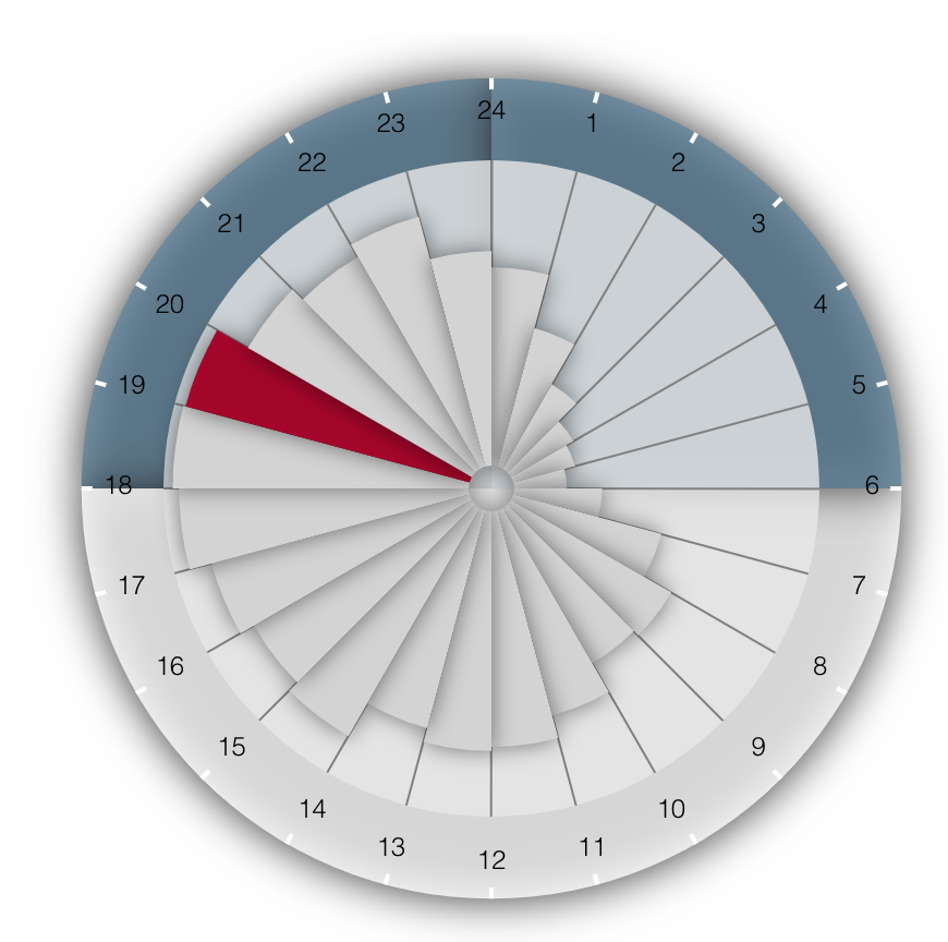 The Disk visualization is designed to visualize metrics across the 24 hours of the day. Hours are rendered from 1 to 24 (or one of the supported formats). The color of the upper half border is darker to represent night and early morning hours.